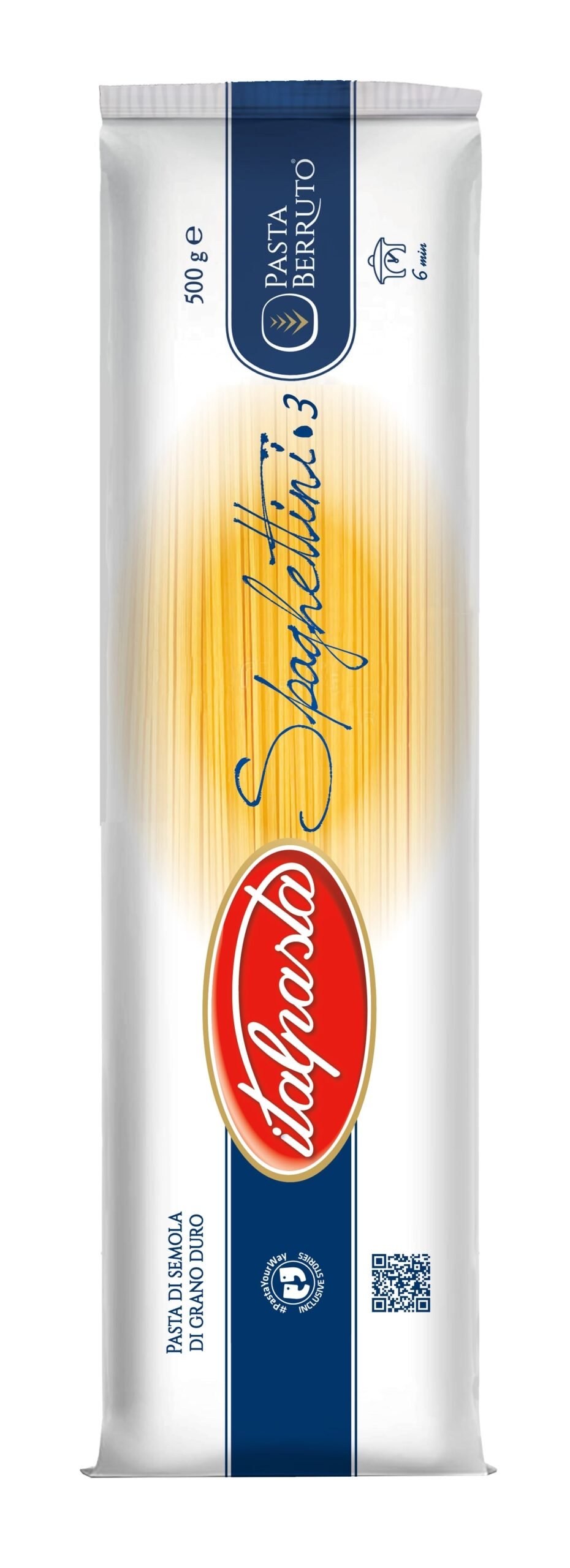ITALPASTA Makaroni Nr.3 SPAGHETTINI ir kvalitatīvi makaroni, kas izgatavoti no cietajiem kviešu miltiem un ūdens. Šie spagetiņi ir ideāli piemēroti dažādu veidu makaronu ēdieniem, pateicoties to smalkajai struktūrai un ātrai gatavošanas iespējai. Produkts ir iepakots ērtās 500 g paciņās, kas nodrošina ilgstošu svaigumu un vieglu uzglabāšanu. Katra iepakojuma enerģētiskā vērtība ir 1476 KJ / 348 Kcal. Lūdzu, ņemiet vērā, ka produkts var saturēt olu daļiņas un soju.